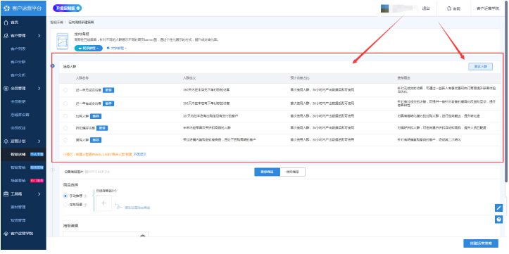 第一步:选择人群,卖家可以选择系统推荐人群,也可以自定义人群;