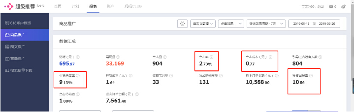 超级推荐不同于直通车,点击率前期不要过于重视,着重放在点击成本和拉新成本上,先把这两项指标降下来,降低了点击成本投资回报率也会相应的得到提升,超级推荐成本低,可以作为一个提高投产的工具。