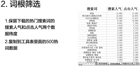 之前组建的还有另外一个表,热门修饰词,把热门修饰词复制到工具箱里面的热词词根表,只需复制词,不需要数据。当把词跟复制完成后,对应的搜索人气和点击人气就会自动匹配出来,这是根据500热搜词而来。接下来是一个优化的步骤,根据点击人气做一个降序排列,删除重复词根,再删除与自己产品不相关的词,属性不相干、风格不相关等等;最小词根的拆除词也要去掉,例如保鲜盒拆出的“保”“鲜”,“保鲜”本身是一个属性词,把保鲜二字再进行拆分就没有太大意义,我们要保证最小单位的词根。