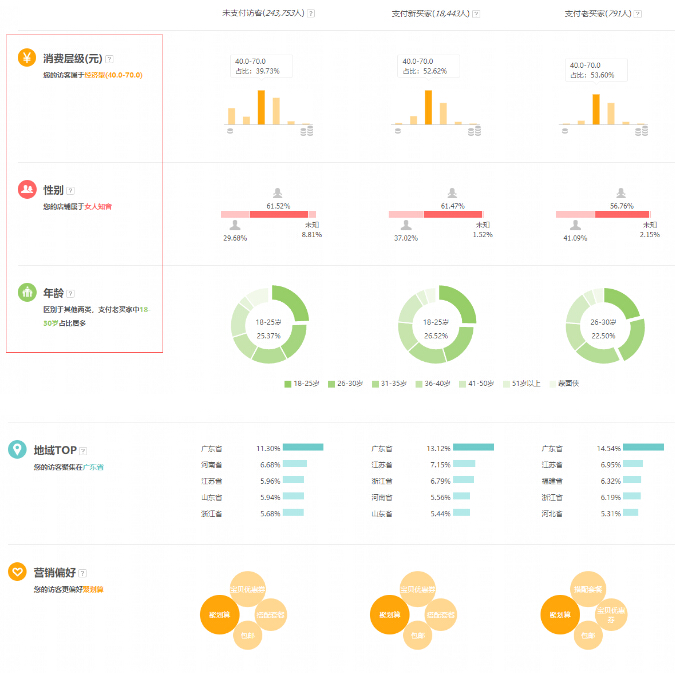 我们打造小而美的商品和店铺,是淘宝发展的趋势,因为现在人群标签的影响越来越大了,如果商品卖的过于杂乱,那么不仅会影响主营占比,间接影响权重,而且人群标签也会混乱,从而影响流量的精准,精准类目的布局,其实就是把店铺的产品布局在主营类目的维度上面,这个维度对应产品的价格区间、产品对应的人群画像、购物喜好以及地域特征。