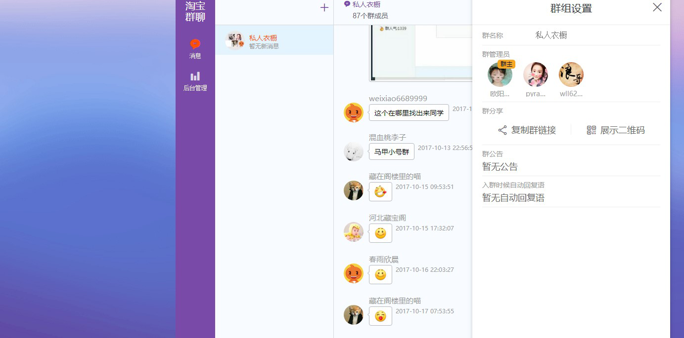 在群里还可以分享图片、分享宝贝的链接、分享微淘的内容,甚至还可以生成二维码,我们可以将二维码的链接做成自定义页面放在店铺首页或者详情页的头部,增加你的粉丝数。还可以把群链接添加到无线端的互动服务窗上,这个也是我们圈粉的利器。其实还有很多地方能够增加你店铺的粉丝数,需要我们自己细致的去寻找。