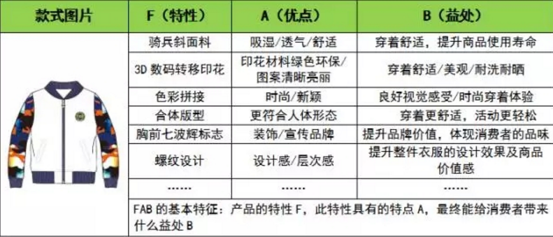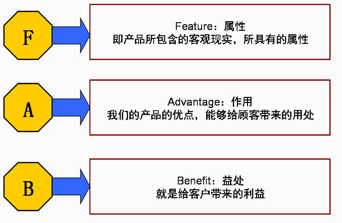 F指属性或功效(Feature货Fact),即自己的产品有哪些特点和属性,A是优点或优势(advantage),即自己与竞争对手有何不同;B是客户利益与价值(benefit),这一优点所带给顾客的利益。 所以FAB关注的是客户的“买点”。