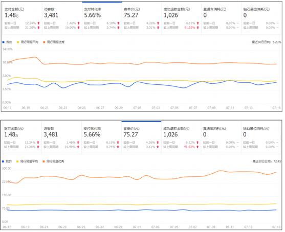 一般我们在理解转化率这个指标的时候,必须综合考虑客单价的问题,在常规的理解中,如果商品的价格比较高,那么支付转化率肯定就会低一些。在手淘首页大概第二屏的位置,我们可以看到跟行业均值相比,本店在客单价和转化率方面的位置: